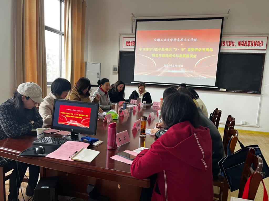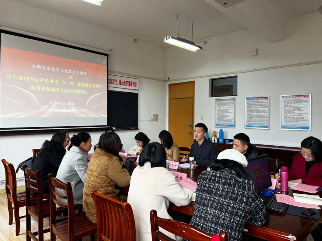 会上,其他8名思政教师代表围绕学习贯彻习近平总书记“3·18”重要讲话精神依次发言。孙文静老师表示作为青年教师应当以身作则,坚定理想信念,深挖理论内涵,创新教学方式。教学要关注学生的思想动态,善于运用生动实例和互动方式激发学生兴趣,培养他们独立思考和创新能力。同时,注重理论与实践的结合,引导学生将所学知识应用于解决实际问题。刘丹丹老师围绕思政课的教学特点就如何利用智能技术实现对课堂教学要素的挖掘分析和完整解构谈了自己的看法,表示要关注大学生思政课学习专注度、情感体验度、内容掌握度等教学有效性问题,在微观机制上研究学生认知情感画像和学习状态量化,在实践路径上实现教学内容的精准供给、教学过程的精准把控和教学效果的精准反馈,进而优化教学方案的设计与实施,真正实现从“入眼入耳”到“入脑入心”的转化。戴少刚老师表示思政课教师要坚持“八个相统一”,加大改革创新力度,不断丰富教学内容、完善教学方法和改进教学手段,增强思政课教学的思想性、理论性和亲和力、针对性,提升课堂参与率、点头率和满意度,培养有理想、有担当、能吃苦、肯奋斗的新时代好青年。姜晓静老师表示思政课教师要时刻牢记习近平总书记嘱托,落实立德树人根本任务,不断提高自己的专业素养和教学水平,真正成为新时代可信、可敬、可靠,乐为、敢为、有为的思政课教师。庞东霞老师表示作为思政课教师,人格要正,第一步就是要精心备课,认真对待每一个知识点,不照本宣科,形成自己的教学风格;第二步以饱满的热情对待课堂的每一分钟,用生动丰富的语言去吸引学生;第三步是用真理的力量感召学生,以深厚的理论功底赢得学生信任,把他们培养成眼里有光的人。聂蕾老师说我们要牢记习近平总书记对思政课教师所给予的重托,按照“六个要”的要求,立足时代、扎根现实,在不断增强本领、提高素质中锤炼自己,努力成长为塑造学生品格、品行、品味的大先生。要坚持不懈地以“八个相统一”的要求不断探索思政课改革创新有效路径,不断增强教学的思想性、理论性和亲和力、针对性,让思政课真正成为大学生真心喜欢、受益终身的课程。汪宏老师说思政课的教学过程其实是一个教师挖掘价值、传播价值——学生认同价值、践行价值的过程,是一个用心付出、双向发力的过程。作为引导学生努力成为“追光者”的我们,在坚持做到“政治要强、情怀要深、思维要新、视野要广、自律要严、人格要正”的基础上,苦练内功,讲深、讲透、讲活思想政治理论课,真正实现“亲其师、信其道”,引领学生共同追求“价值之光”。毛绎然老师说作为一名青年思政课教师,要严格按照习近平总书记的要求尽快成长,一方面,努力提高理论水平。要在刻苦研读原著中夯实马克思主义理论专业知识,熟练掌握并能正确运用马克思主义的立场观点方法。用科学研究的方式把教学中的难点、疑点研究深、研究透,逐渐形成自己的研究方向和研究领域,提升学理的穿透力。另一方面,努力提升教学水平。要面向学生实际,着重关注学生思想上的疑点和难点,充分运用多元化的教育载体,在教学中努力把传道、授业和解惑相结合,向学生传授马克思主义理论的科学知识,及时澄清学生的价值困惑,进而启迪学生自觉形成崇高的社会理想和人生价值观。