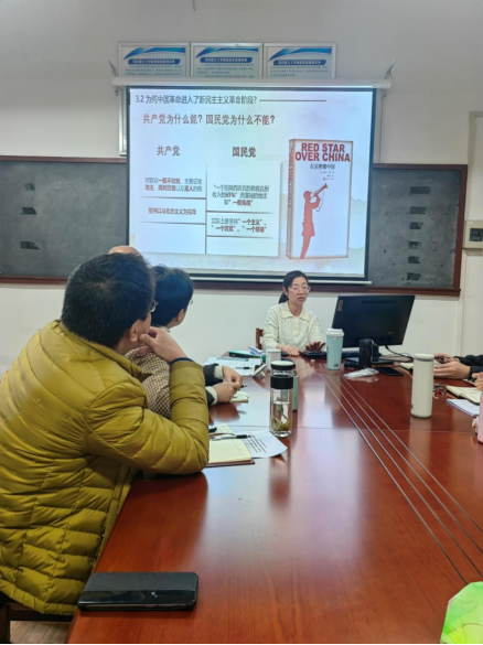 备课会第二环节,由胡蓉老师围绕“新民主主义革命理论形成的依据之一——中国共产党为什么能?”这一主题进行教学展示。胡蓉老师从近代中国国情出发,用科学的理论、丰富的案例讲清楚了只有中国共产党才能肩负起实现中华民族伟大复兴的历史使命。在交流研讨环节,参会教师围绕着教材第二章第一节“新民主主义革命理论形成的依据”,从教学目标、教学重难点、教学方法,教学过程等内容进行集中研讨,大家集思广益,讨论热烈,纷纷表示受益匪浅。