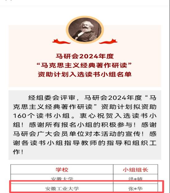 近日,中国高等教育学会马克思主义研究分会 2024 年度“马克思主义经典著作研读”资助计划名单揭晓,学院精心组织申报的“习近平的文化和意识形态理论课题”读书小组成功入选。