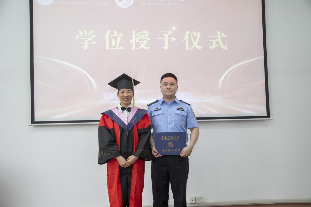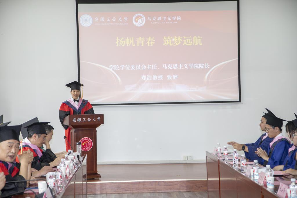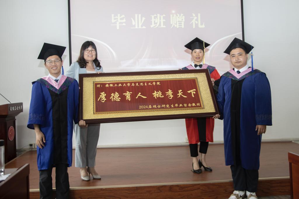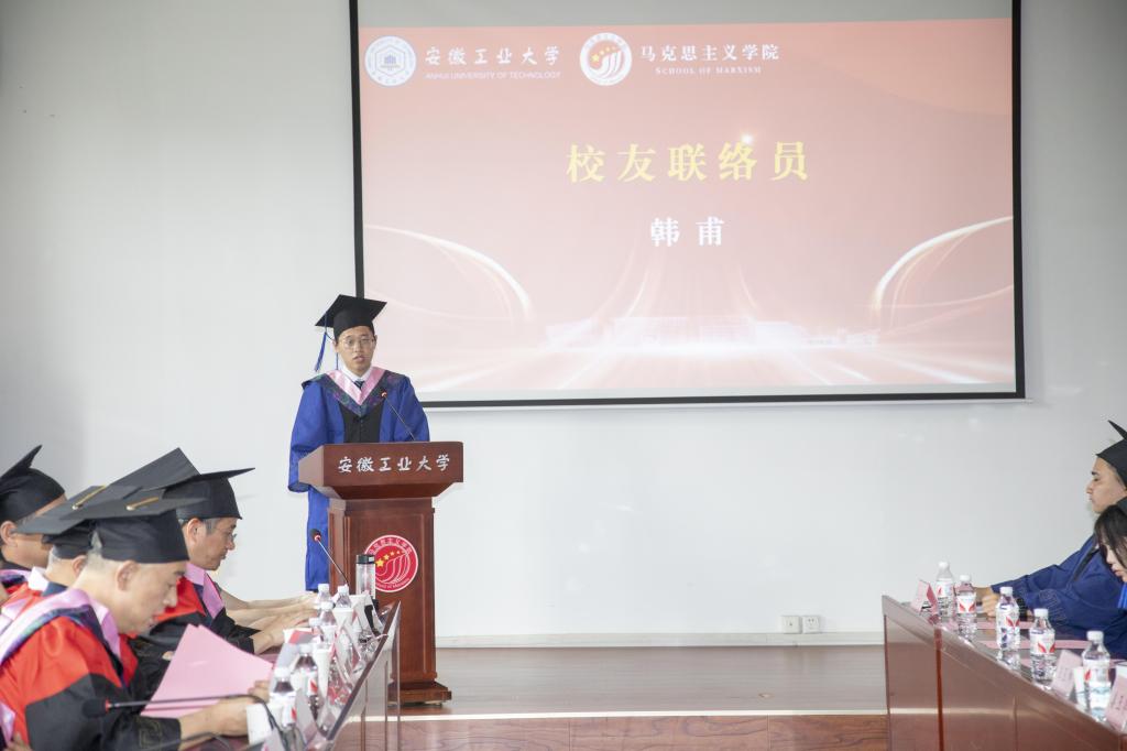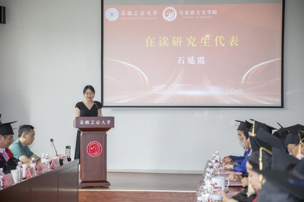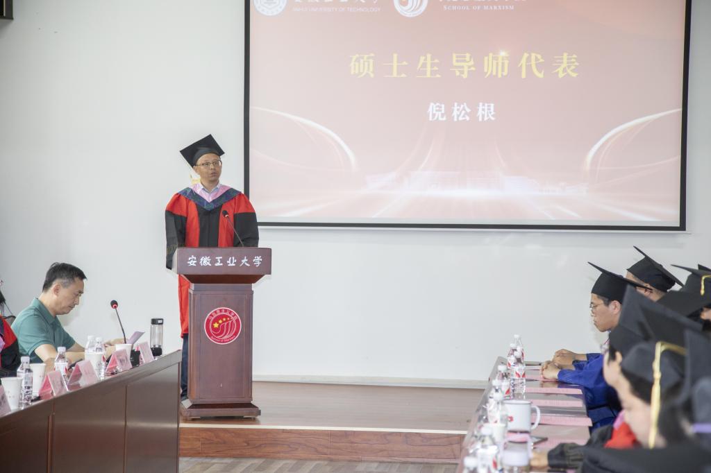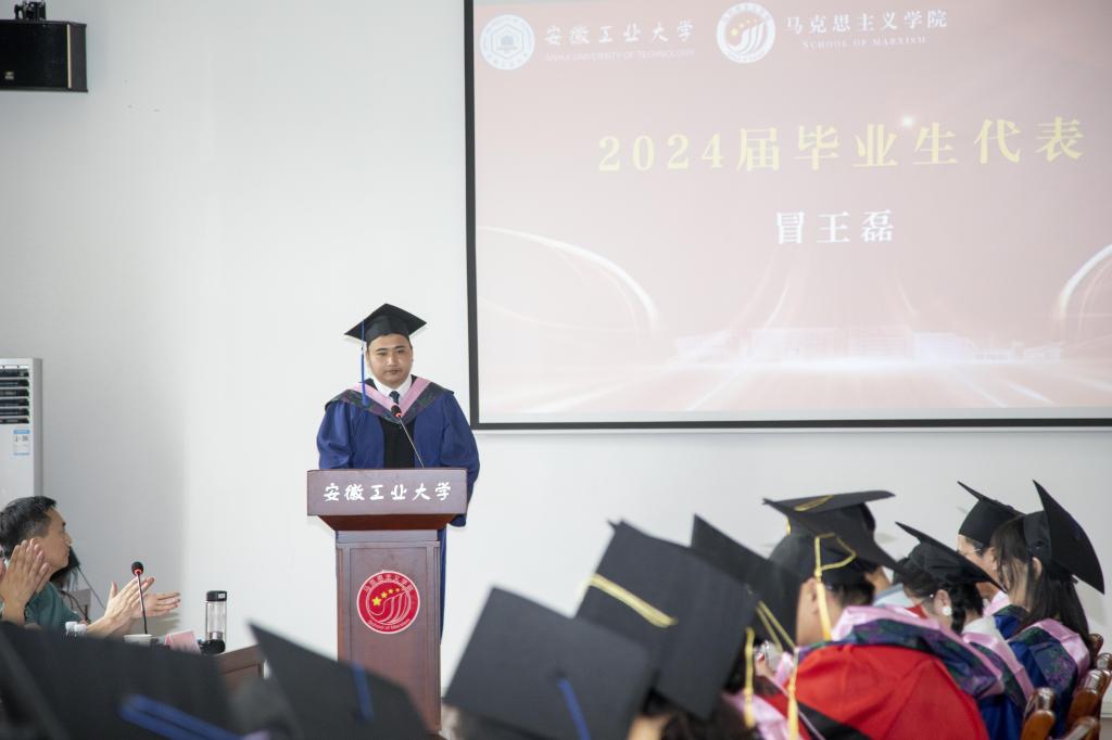 冒王磊同学作为2024 届毕业生代表发言,他表示,感谢马院全体领导、老师在学习、生活、工作等各个方面的关心和支持。在未来时刻牢记自己作为一名共产党人的初心使命,在平凡的岗位上做好本职工作,更加努力追求进步。2022级研究生在校学生代表石延霞向各位毕业生送上最美好的祝愿,表达了在成长中获得帮助的感谢之情,表示更加珍惜在校园时光,接过接力棒继续前行。2024届校友联络员韩甫表示,作为校友联络员,要承担好责任,发挥好母校与校友之间的纽带作用,努力履行好职责。倪松根老师作为导师代表寄语毕业生,要勇于求真,把稳人生航向;要敢于拼搏,砥砺人生本色;要务实肯干,成就精彩人生,表达了对毕业生的殷殷嘱托和美好期望。