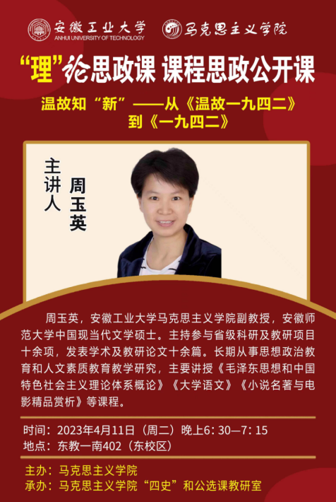 第八期““理”论思政课”将于本周二(4月11日)晚上6:30-7:15在东教一南402(东校区)举行,本期主题是“课程思政”公开课。课程主讲人为周玉英老师,请各位老师积极参加,前往观摩。