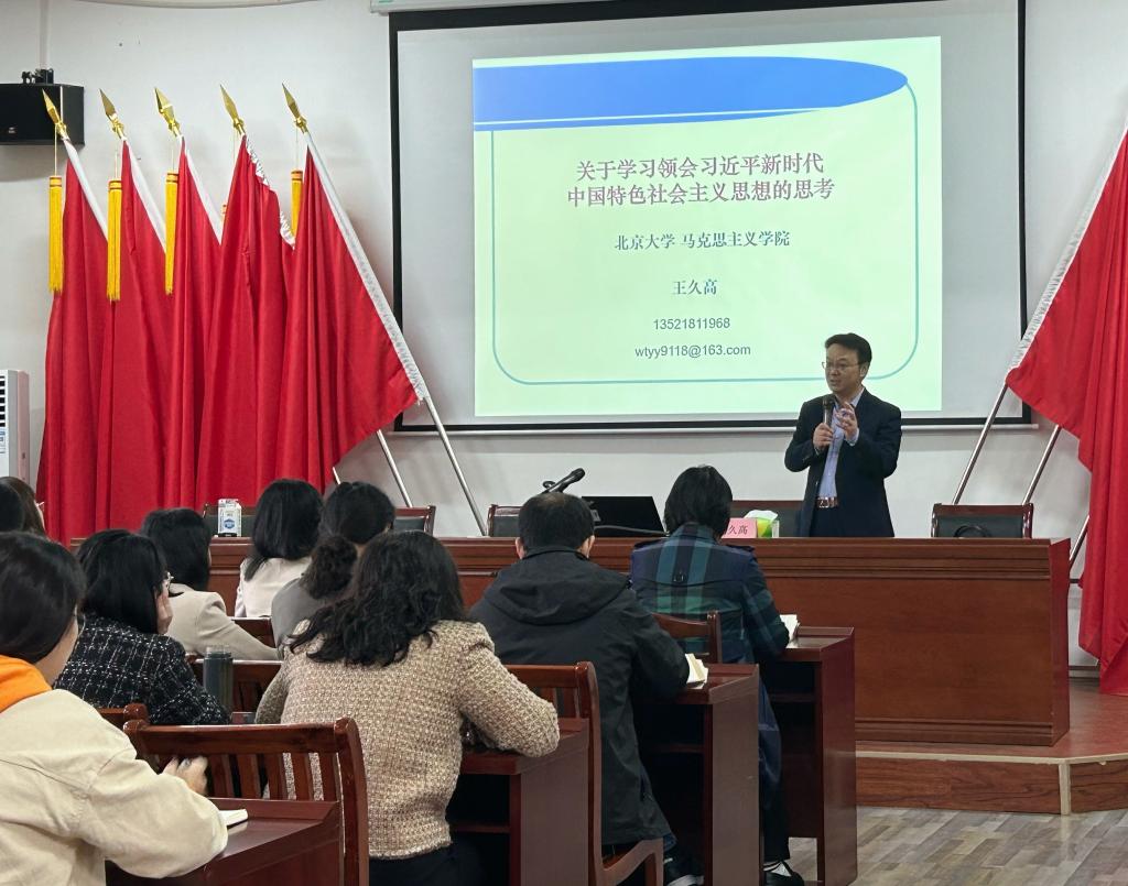 王久高教授围绕“社会主义”、“改革开放”、“文化强国”、“民生保障”与“社会建设”、“党的理论创新”、“理论建党”等方面对学习贯彻习近平新时代中国特色社会主义思想进行了阐述与分享;随后他总结了学习领会习近平新时代中国特色社会主义思想的意义,强调要掌握“十个明确”、“六个坚持”,重点要把握好习近平新时代中国特色社会主义思想的世界观与方法论,坚持好、运用好贯穿其中的立场、观点、方法,坚持活学活用、学以致用。